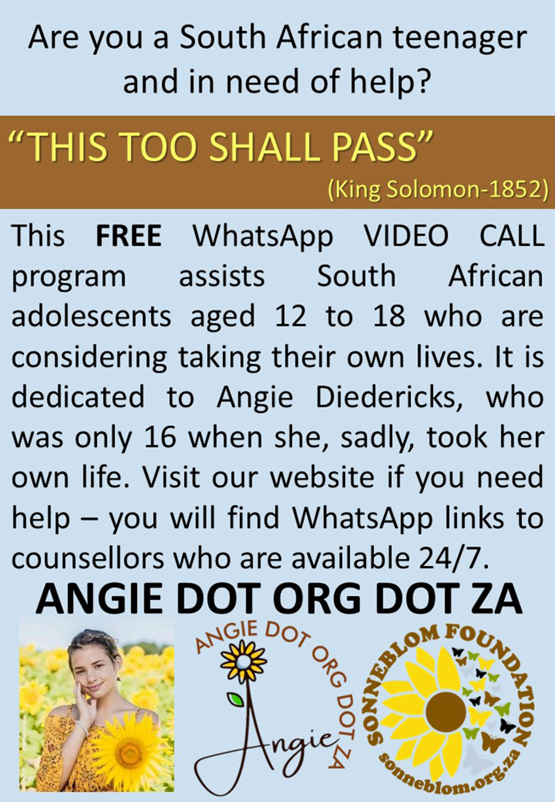 Visit the website, https://angie.org.za/, for direct WhatsApp links to counsellors.